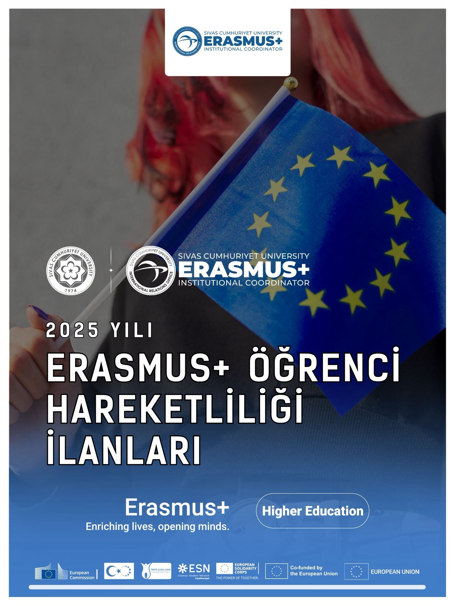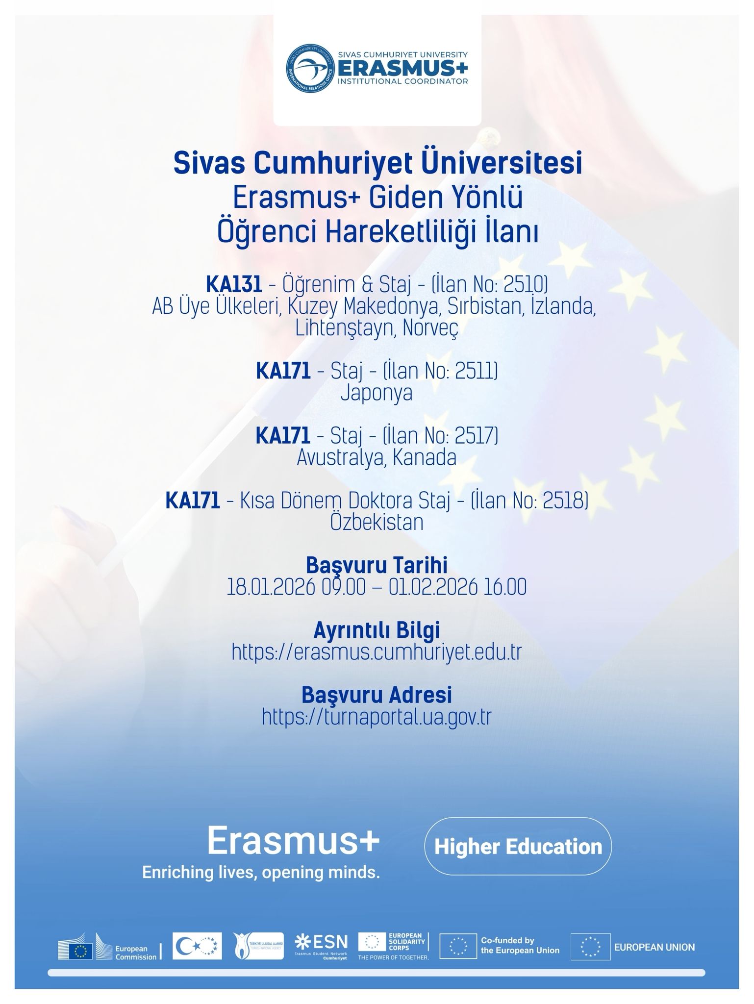 Sivas Cumhuriyet Üniversitesi 2025 yılı Erasmus+ Öğrenci Hareketliliği İlanları yayımlanmıştır. Başvurular 18.01.2026 09.00 – 01.02.2026 16.00 arası T.C. Dışişleri Bakanlığı Avrupa Birliği Başkanlığı Avrupa Birliği Eğitim ve Gençlik Programları Merkezi Başkanlığı (ABEGPM – Türkiye Ulusal Ajansı) tarafından işletilen TURNAPortal sistemi üzerinden alınacaktır.